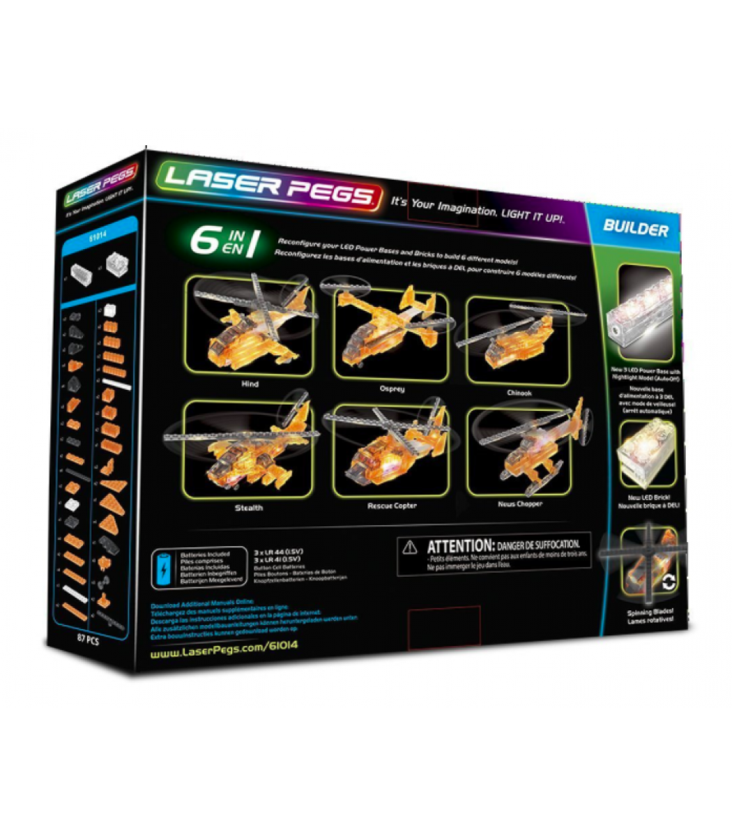 Laser Pegs are a classic building toy allowing kids to build anything from helicopters to robots, monster trucks to animals, or dinosaurs to spaceships! All Laser Pegs kits can build multiple models and can be combined with all major building blocks such as Lego®, Knex®, Mega Bloks®, Magformers®.